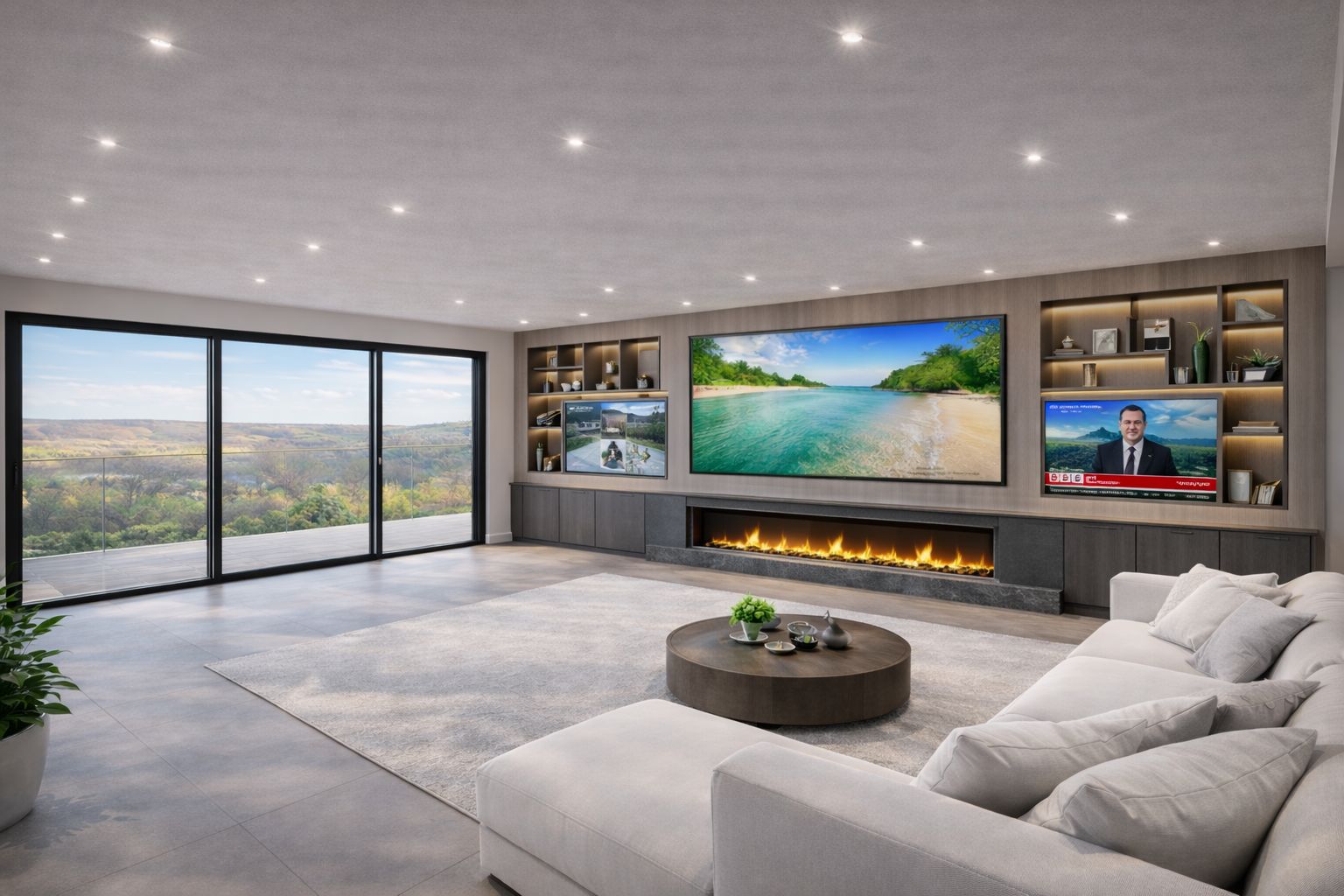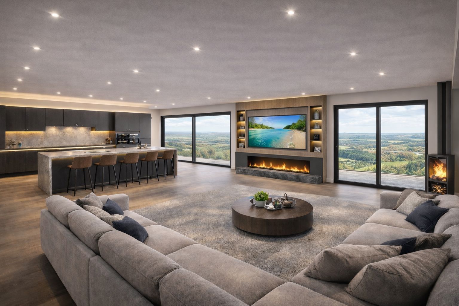 Lounges, log fires, media walls, modern living/kitchen/dining areas all opening out through folding/sliding glass doors onto the extensive balconies, overlooking the greenery of the hills and valley.