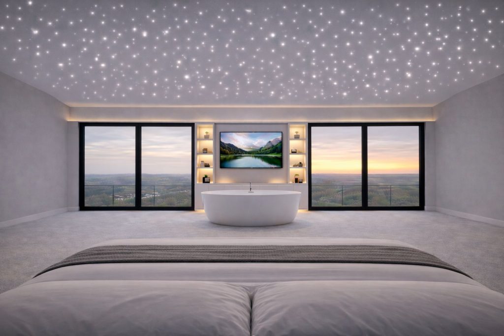 Effortless luxury, fully automated Digital Home, with attractive passenger lift to all floors, spiralling staircases, self-sufficient solar powered property, earning income from the natural sunshine effect on the huge roof, underfloor heating, extensive illuminated, landscaped private gardens, with countryside living and views, leading into woodland with additional landscaped garden space for tennis court/outside swimming pool, etc.