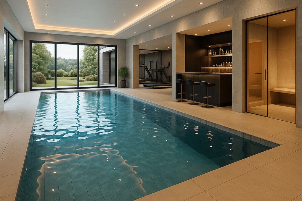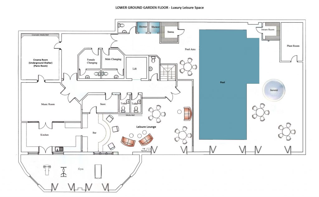 Large indoor heated Swimming Pool (12 metres x 6 metres), Steam Room, Sauna, Changing Rooms, Gymnasium – all opening out through folding/sliding glass doors onto extensive private gardens with inside and outside bars, leisure area kitchen, bar cellar, music room, cinema room and secure underground bunker safe room.