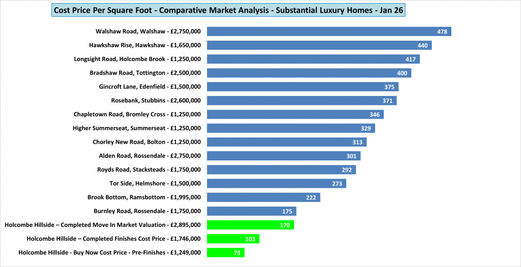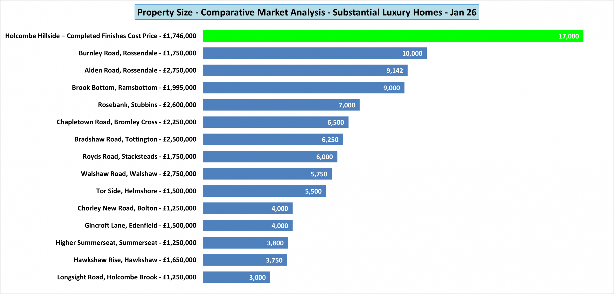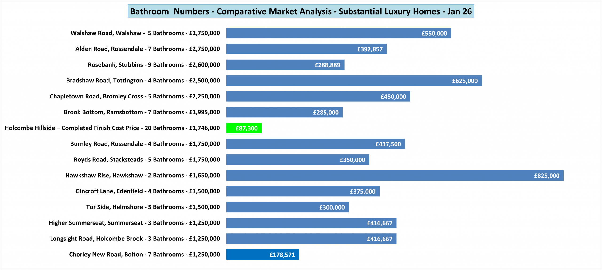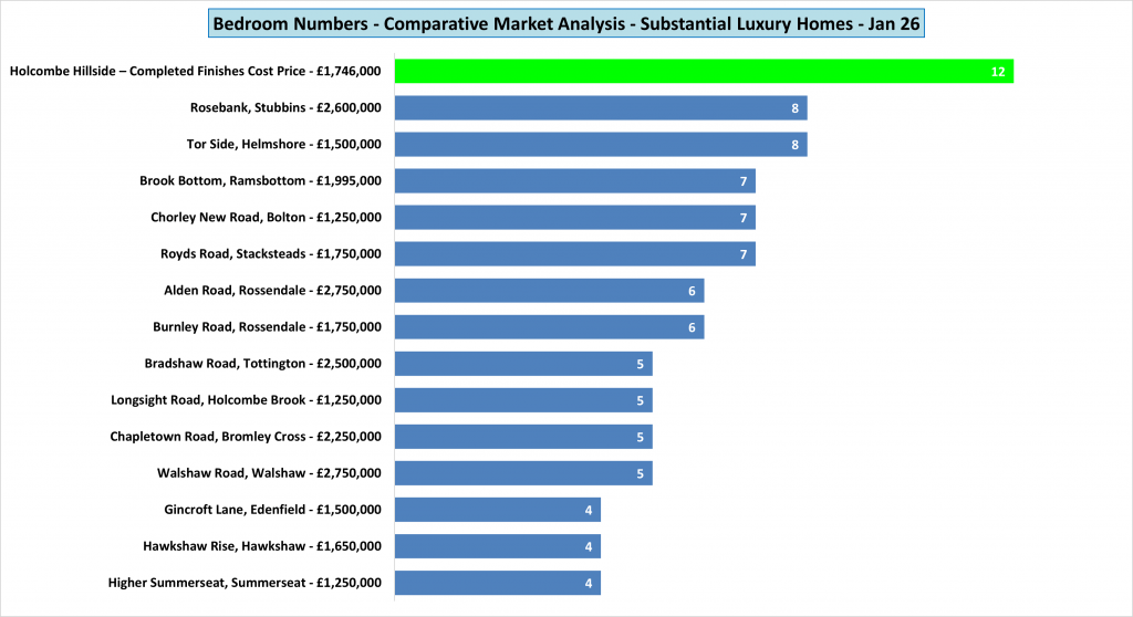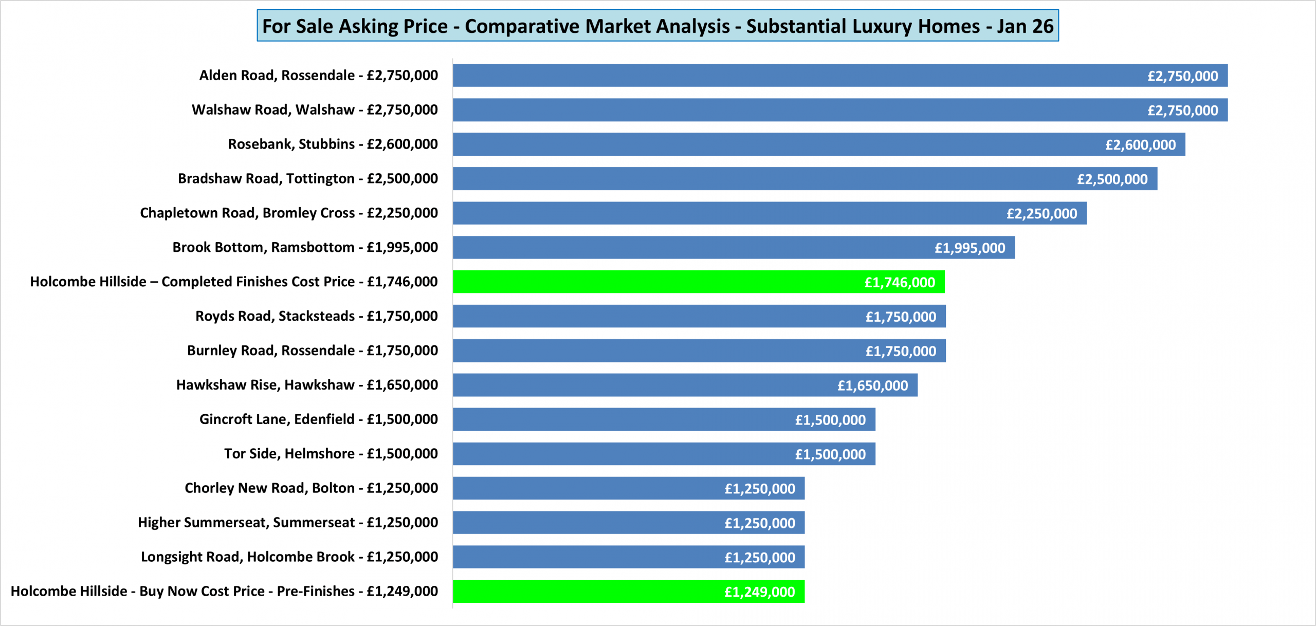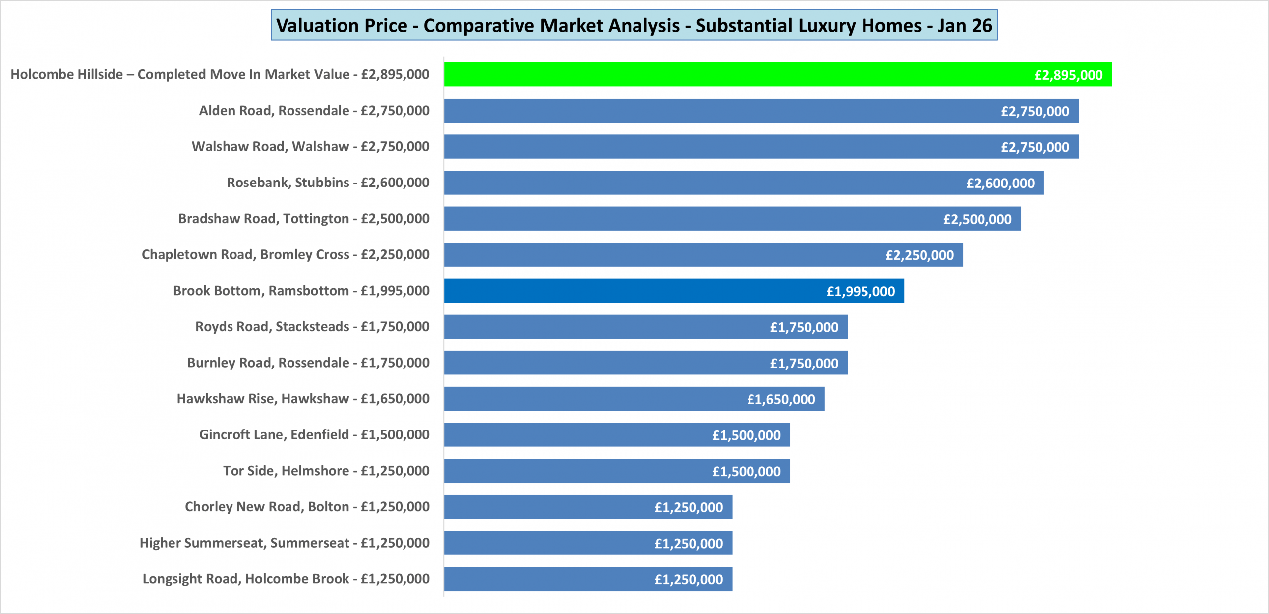 The following up-to-date information and data compiled on 10th January 2026, compares substantial, executive, family leisure properties valued in excess of £1.25 Million, presently or recently on the market within a 5 miles radius of Hillside Holcombe, Ramsbottom.